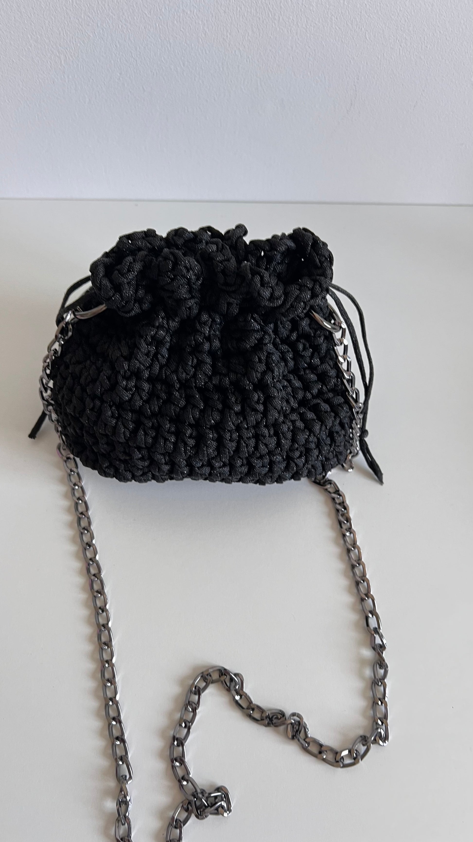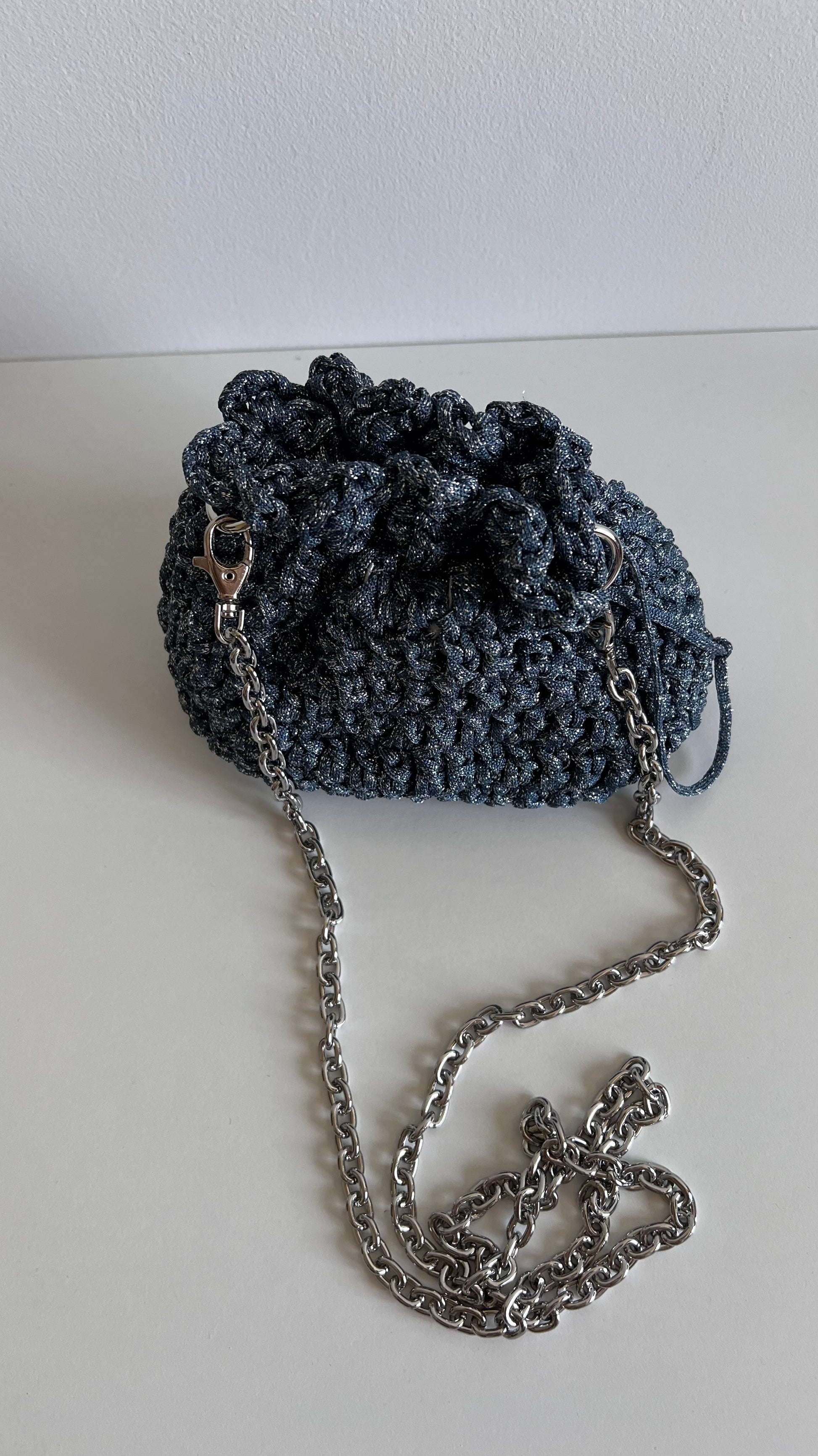 Sacchetti o realizzato ad uncinetto, foderato e munito di catena tracolla.